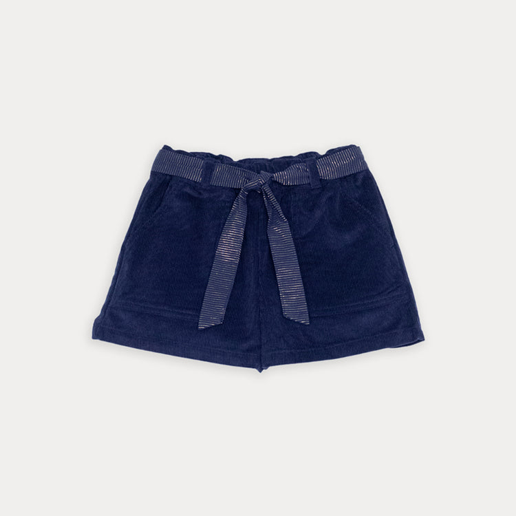 Short De Corduroy Azul Marino Con Cinturón De Popelina Ligera Estampada Para Niña