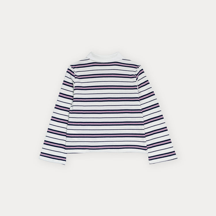 Chemise De Algodón Crema Manga Larga Con Estampado De Rayas Y Bordado De Flor Fucsia Para Niña