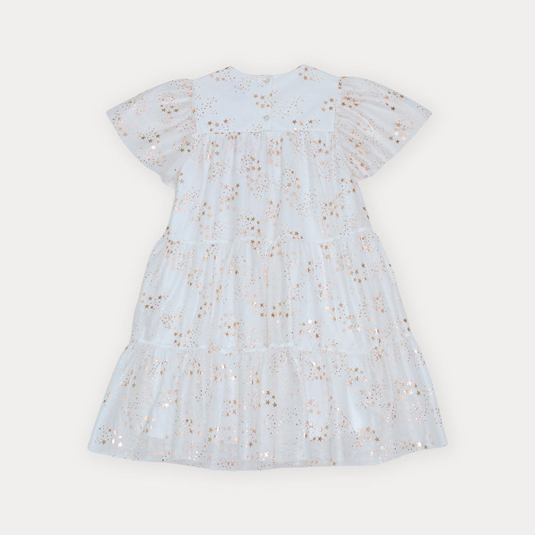 Vestido De Tela Ligera Crema Con Estampado De Estrellas Doradas Metálicas Para Niña
