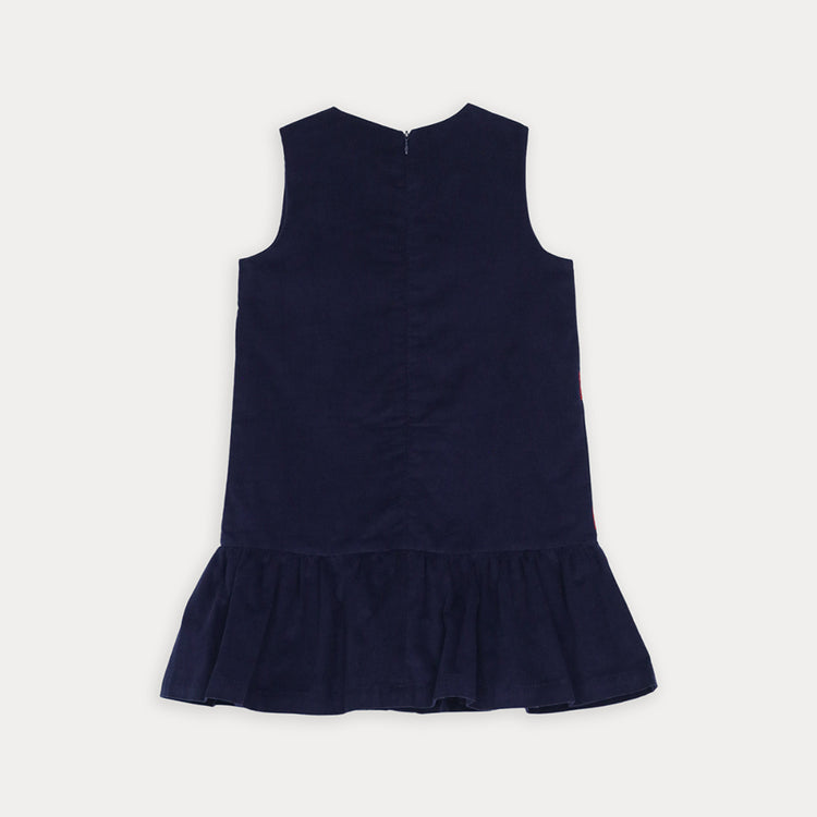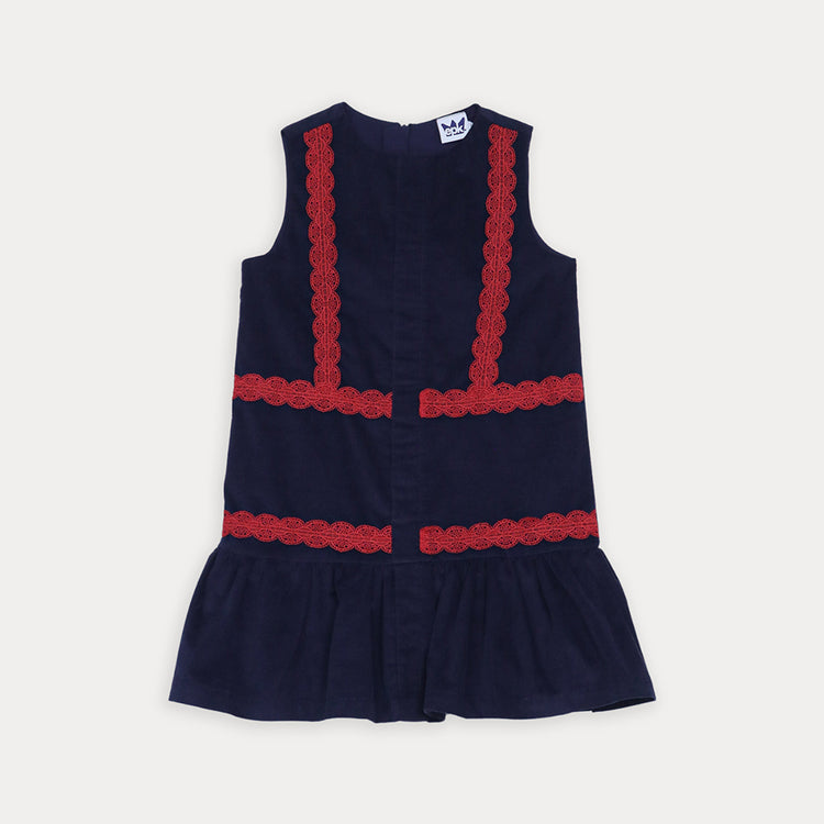 Vestido De Corduroy Azul Marino Con Guipur Rojo Para Niña