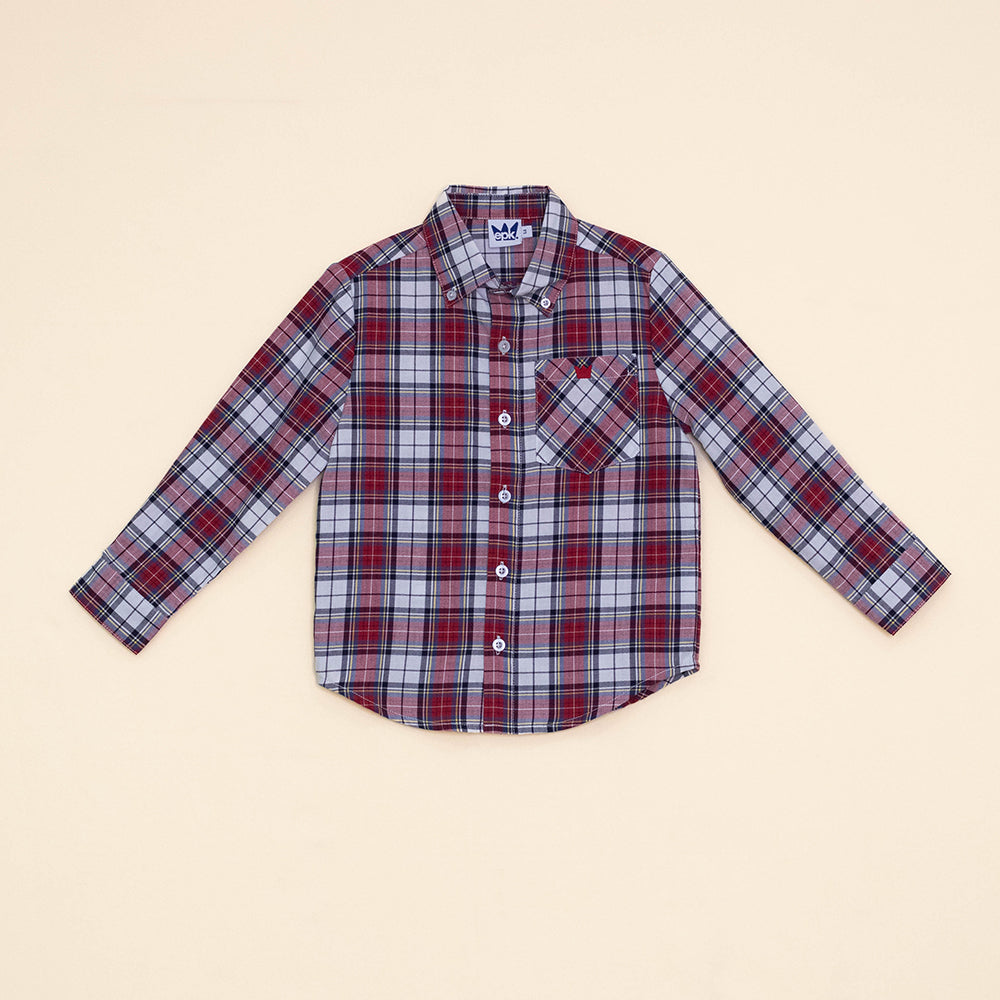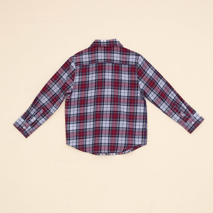 Camisa Blanca Manga Larga de Popelina con Cuadros Azules y Rojos para Niño