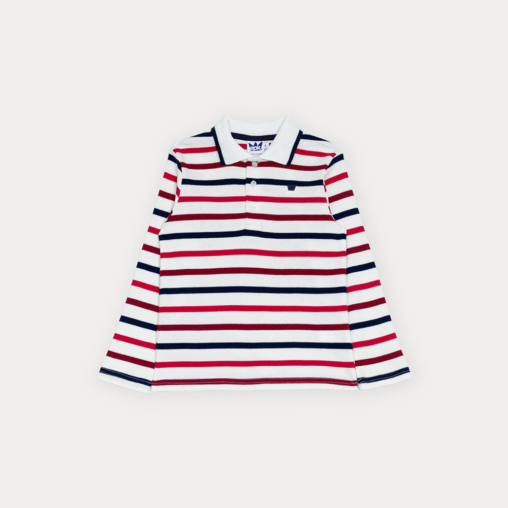 Chemise roja manga corta con rayas blancas en mangas y cuello, con un tiburón bordado