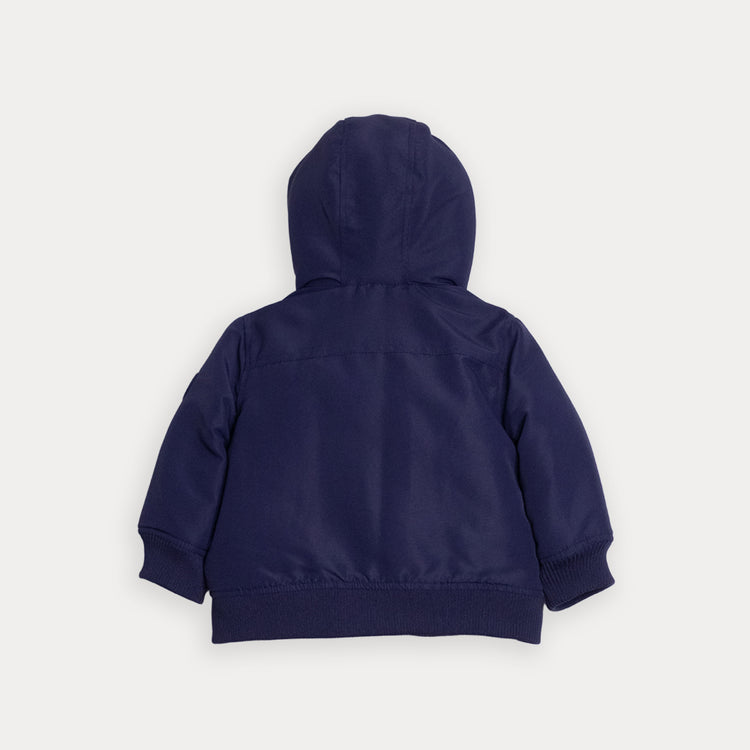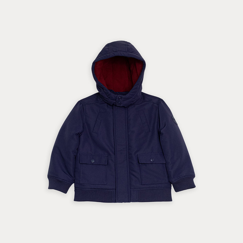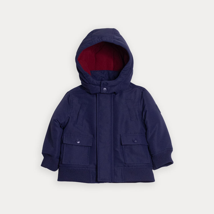 Chaqueta Acolchada Azul Marino Con Forro Rojo Y Capucha Para Bebe Niño